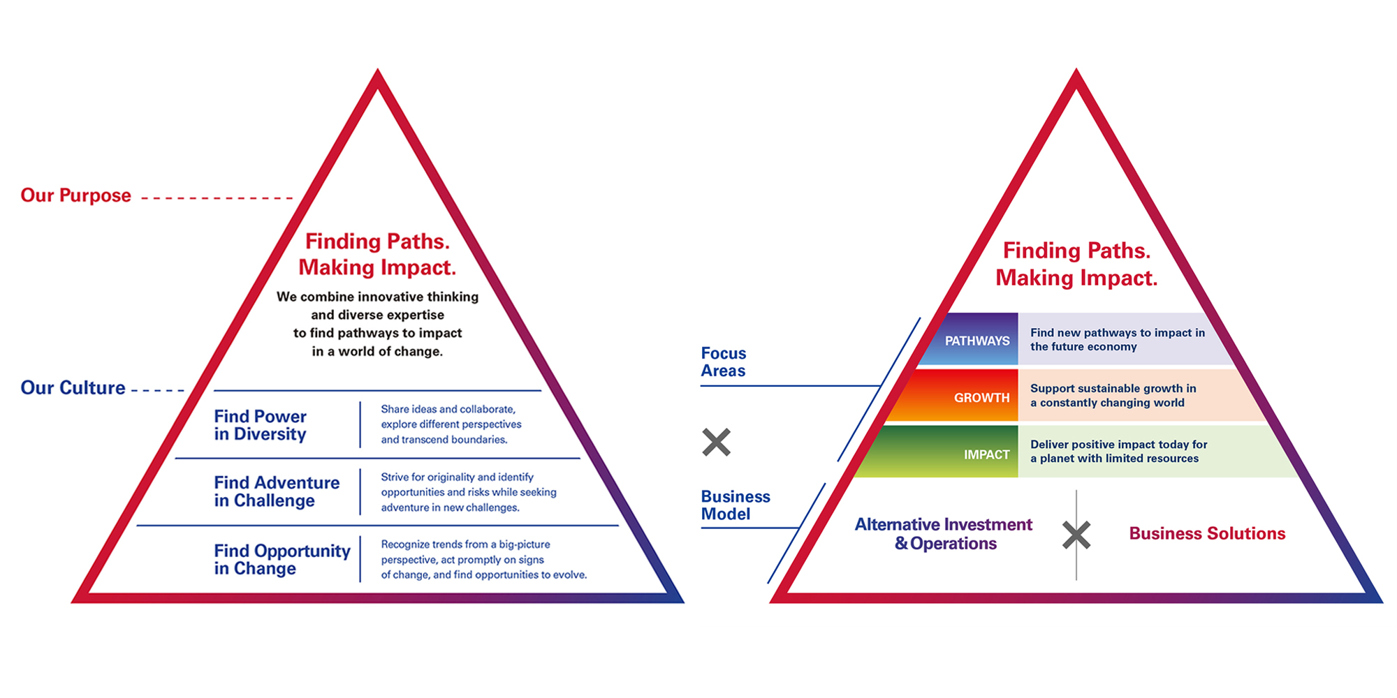 随着迈向2050年实现碳中和的步伐不断加速,推动循环型社会建设,以及应对全球人口增长与老龄化等课题,企业所肩负的社会责任愈加重大。为顺应这一全球趋势,欧力士启动了“企业宗旨探索项目”(ORIX Group Purpose Discovery Project),重新定义集团的企业宗旨与文化。该项目以来自全球103名集团员工参与的工作坊为核心,围绕“欧力士集团在社会中的存在意义”和“全球员工应共同坚守的核心价值观”进行了深入讨论,并于2023年正式发布了“ORIX Group Purpose & Culture”。此外,为践行企业宗旨,欧力士集团于2025年制定了“ORIX Group Growth Strategy 2035”,以三大战略性聚焦领域和两大业务模式为双引擎,明确了未来的整体发展方向。