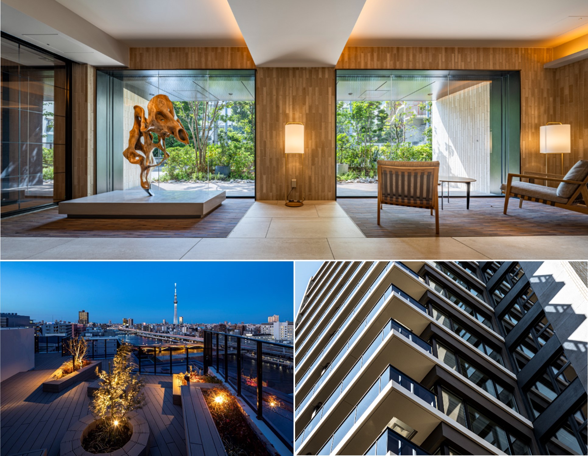 - 緑豊かな前庭と一体になったエントランスホール、隅田川の眺望を生活空間に取り込む大開口のコーナーウインドー、屋上庭園などと街が一体化した生活空間を実現。