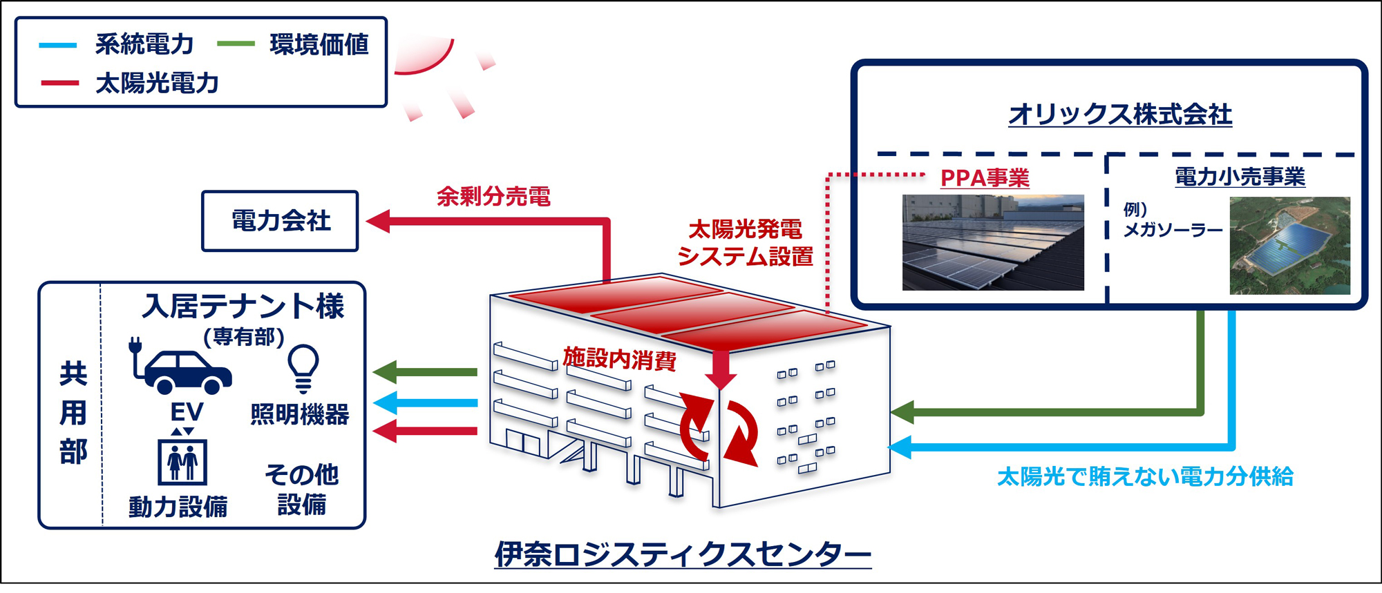 施設屋根には第三者所有モデル※4による太陽光発電設備を設置し、発電した電力を施設内で利用します。また夜間や天候不良時など太陽光発電による供給が不足する場合でも、オリックス株式会社より非化石証書付き(トラッキング付き)の電力を供給することで、入居テナント企業は使用電力の100%を再生可能エネルギー由来電力として利用可能です。