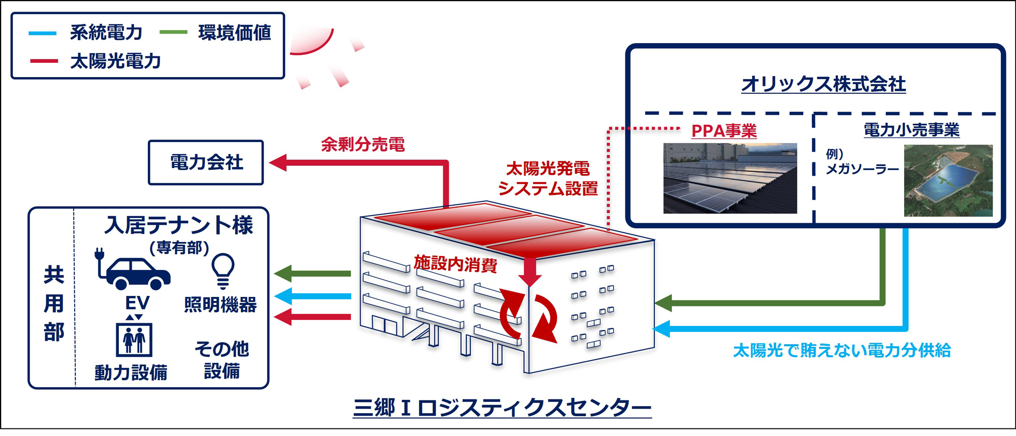当社はこれまで、東名阪を中心に55物件の物流施設の投資・開発を進めてまいりました。2022年3月以降、すべての物流施設を環境配慮型施設として開発しており、屋上に設置した太陽光発電設備により、再生可能エネルギー電力を供給しています。また、天候不順や夜間など発電量が不足する場合にも、オリックス株式会社より非化石証書付き(トラッキング付き)の電力を供給することで、入居テナント企業は使用電力の100%を再生可能エネルギー由来の電力として使用することができます。
