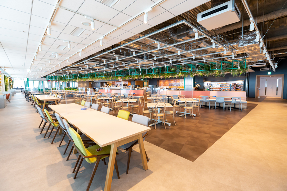 東京本社には社員同士が気軽に交流できるラウンジを設置。食堂を併設して栄養バランスの取れた食事を提供するほか、世界各地の植物を配置し、グループの多様性を表現するとともに心身を癒す空間を演出しています。 - 健康増進・ストレス緩和の取り組み