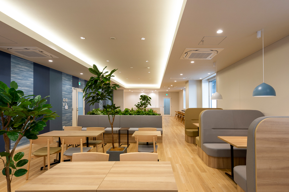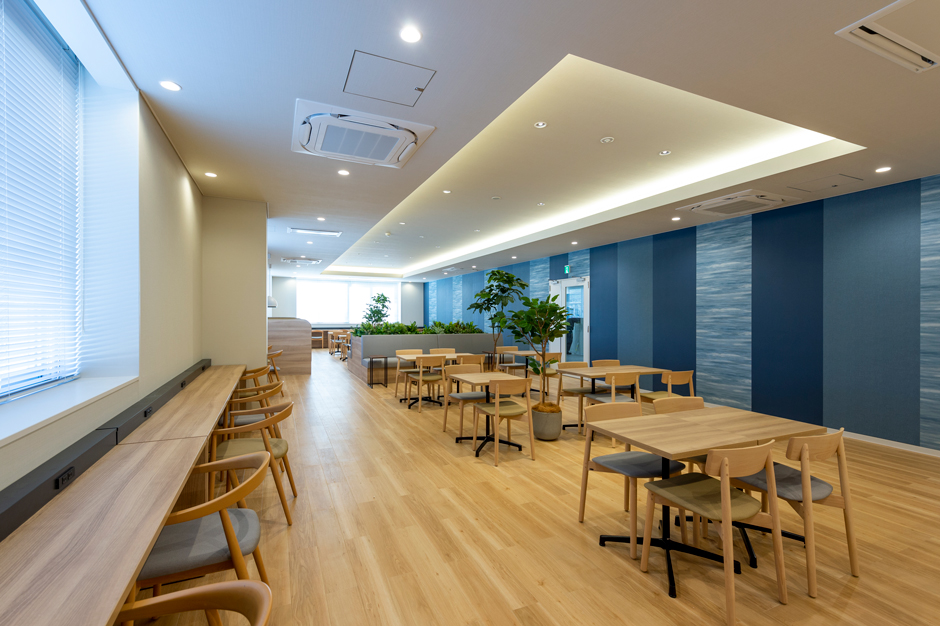 The warehouse areas on all first to fourth floors are equipped with air-conditioning systems to create a comfortable working environment for tenant companies’ employees, regardless of the season. Furthermore, each floor includes a dedicated café lounge, inspired by the traditional indigo dyeing culture of Misato, for tenant companies. These lounges are equipped with a variety of seats*2, such as table seating, sofas, and counter seating, allowing them to be used for many purposes, including lunch and breaks.