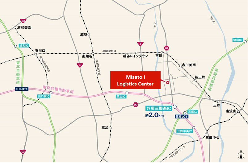 Misato I Logistics Center is located approximately 2 km from the Tokyo Gaikan Expressway’s Gaikan Misato-Nishi Interchange (IC) and allows deliveries to central Tokyo within an hour, with excellent access for wide-area distribution across the Tokyo Metropolitan Area.